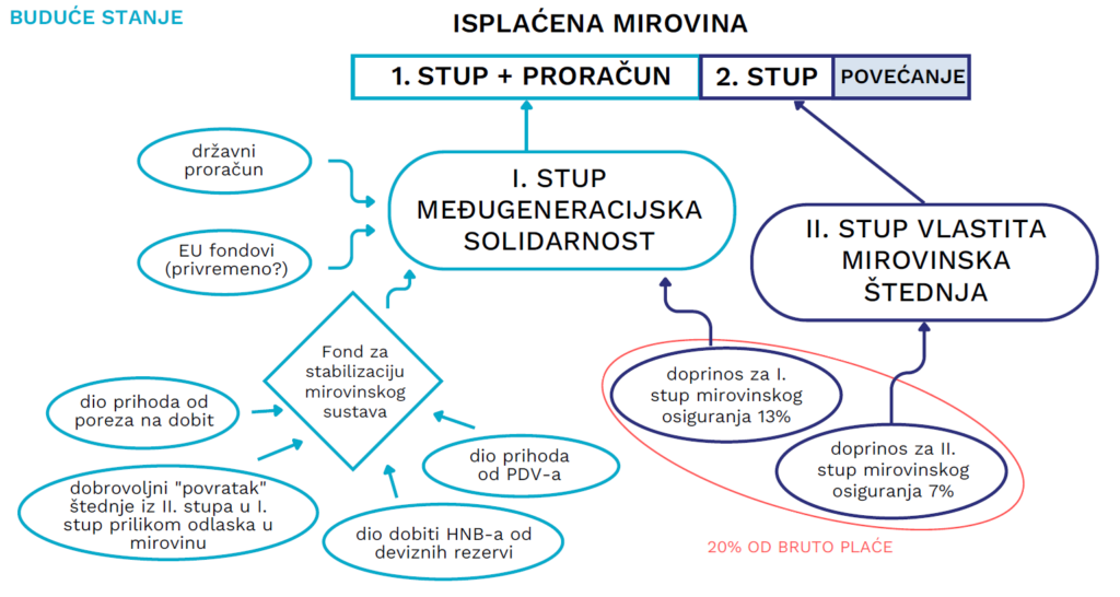 S obzirom na vrlo nepovoljnu demografsku strukturu stanovništva gdje je čak i sada na vrhuncu ekonomskog ciklusa vrlo nepovoljan omjer umirovljenika i zaposlenih, ukoliko u budućnosti želimo imati pristojne mirovine, nužnost je u većoj mjeri se oslanjati na vlastitu štednju za mirovinu. Upravo zato predlažemo povećanje izdvajanja za II. stup mirovinskog osiguranja s trenutnih 5% na budućih 7% čime bi se izdvajanje za vlastitu štednju povećalo za 40% u odnosu na trenutne iznose.