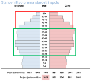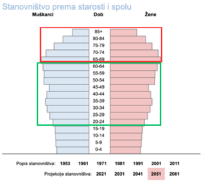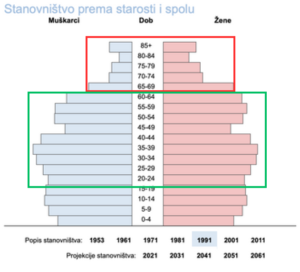 Demografsko starenje stanovništva se najbolje vidi kroz promjene demografske piramide. Ovdje uspoređujemo starosnu strukturu stanovništva u godinama 1991., 2021. i procjenu za 2051. godinu.